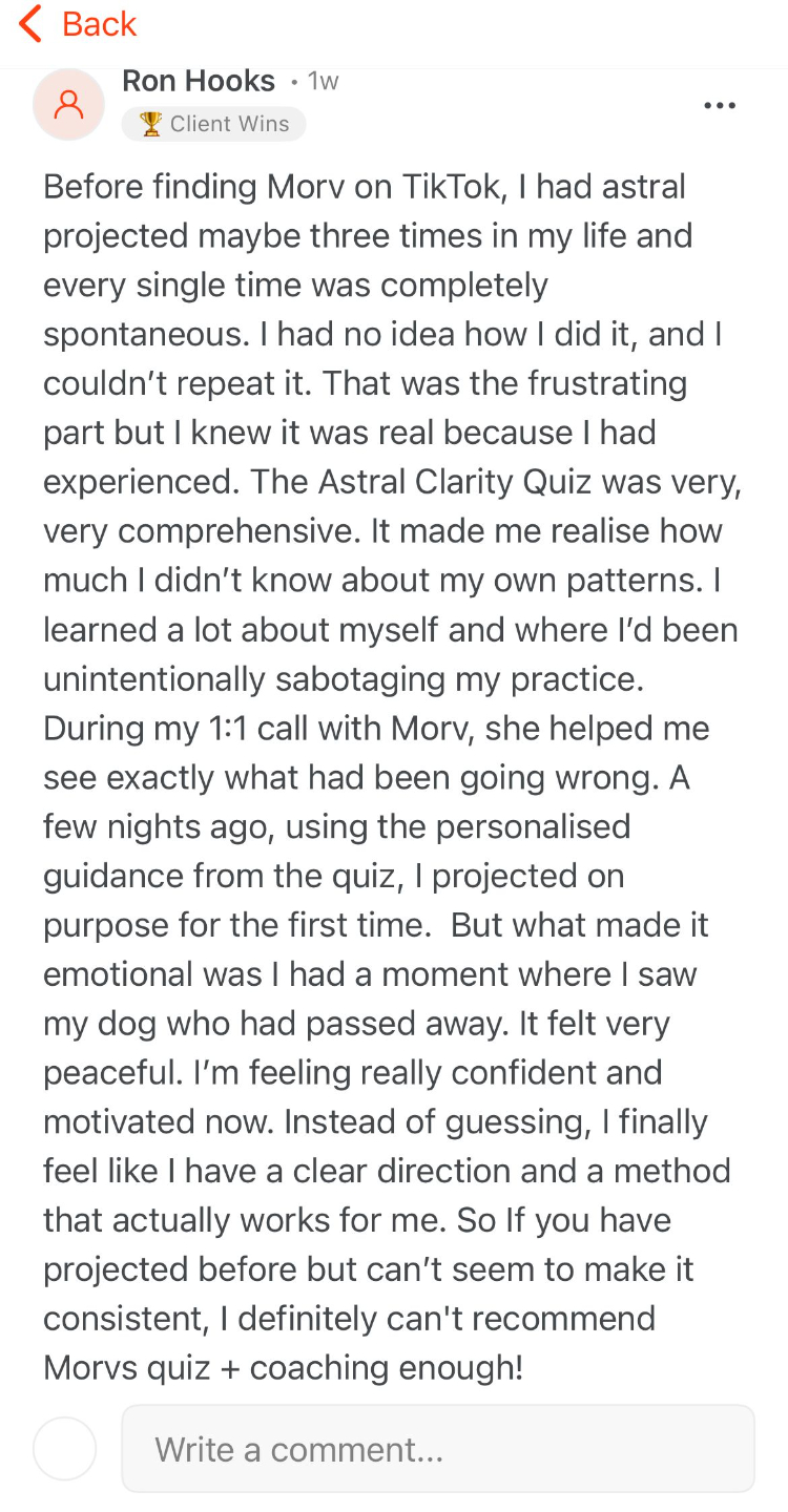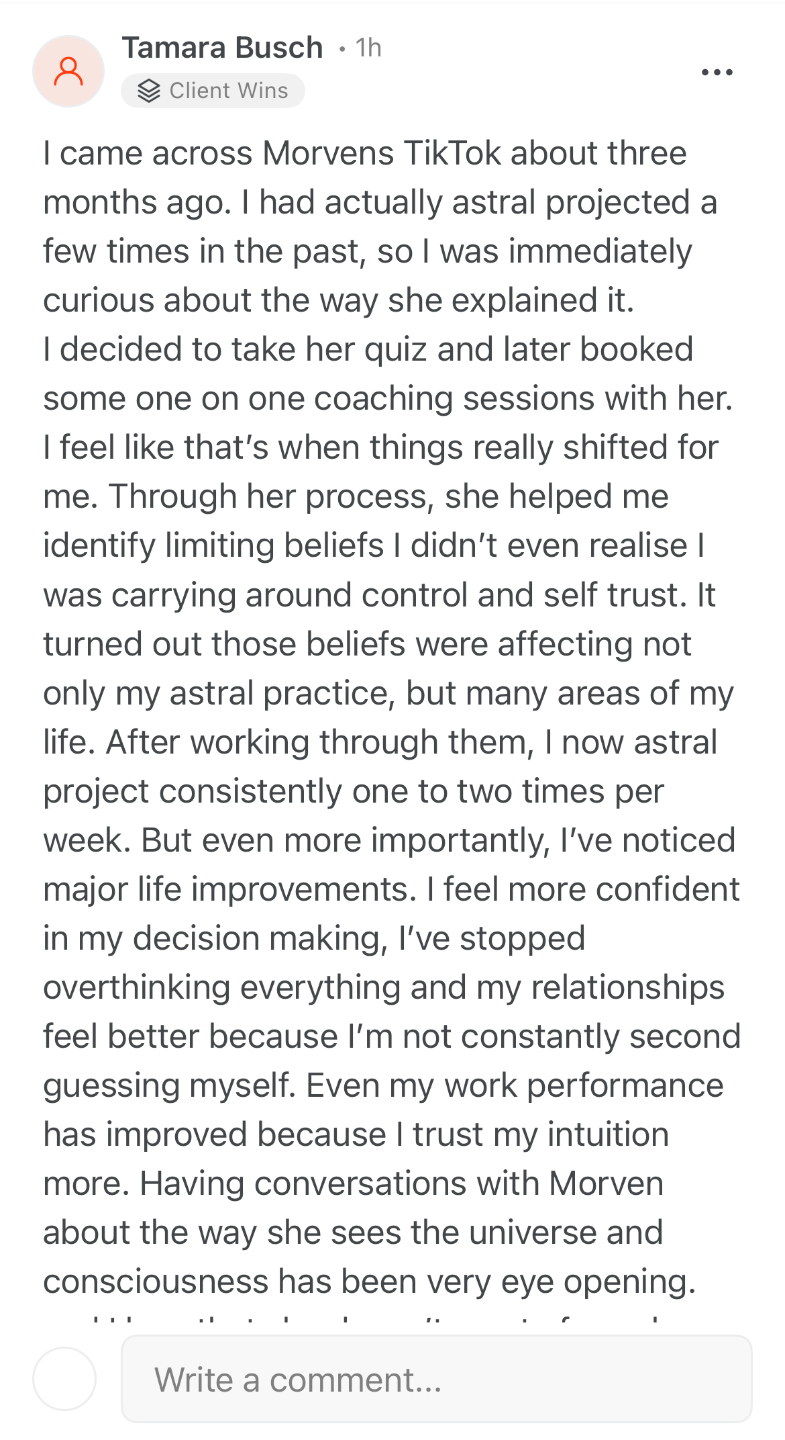 It’s a personalised report where you’ll receive your exact exit strategy and next steps, based on patterns I’ve identified from reviewing hundreds of astral projection attempts.