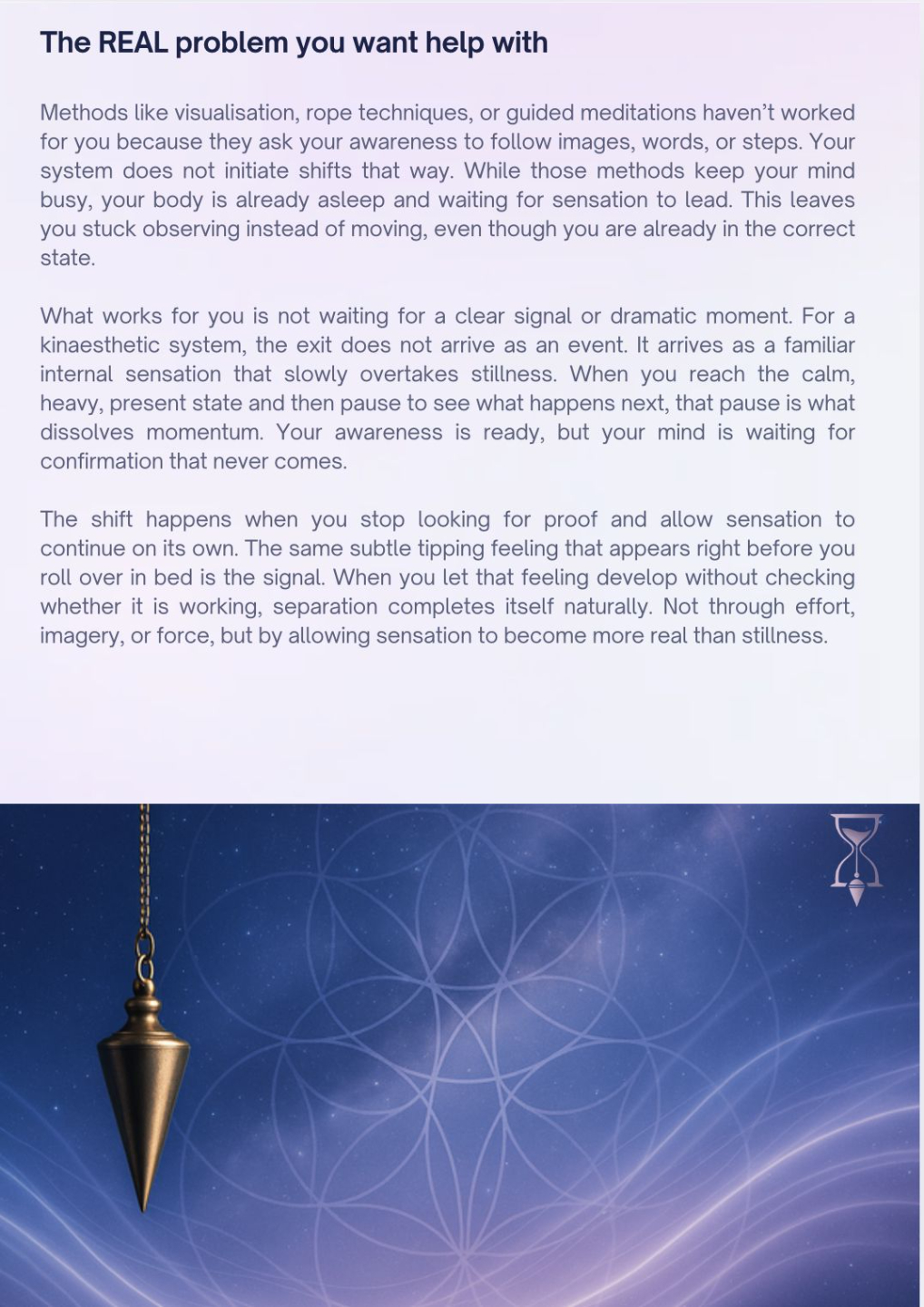 This is where insight turns into relief. This section explains how your rep system ranking affects the way your awareness shifts, why certain sensations or experiences show up first for you, and why some methods feel natural while others feel frustrating. It reframes past “failed” attempts as information, not mistakes, and shows you how working with your natural style removes unnecessary friction.