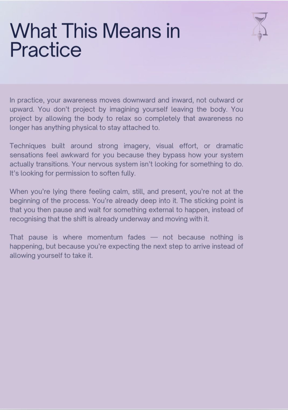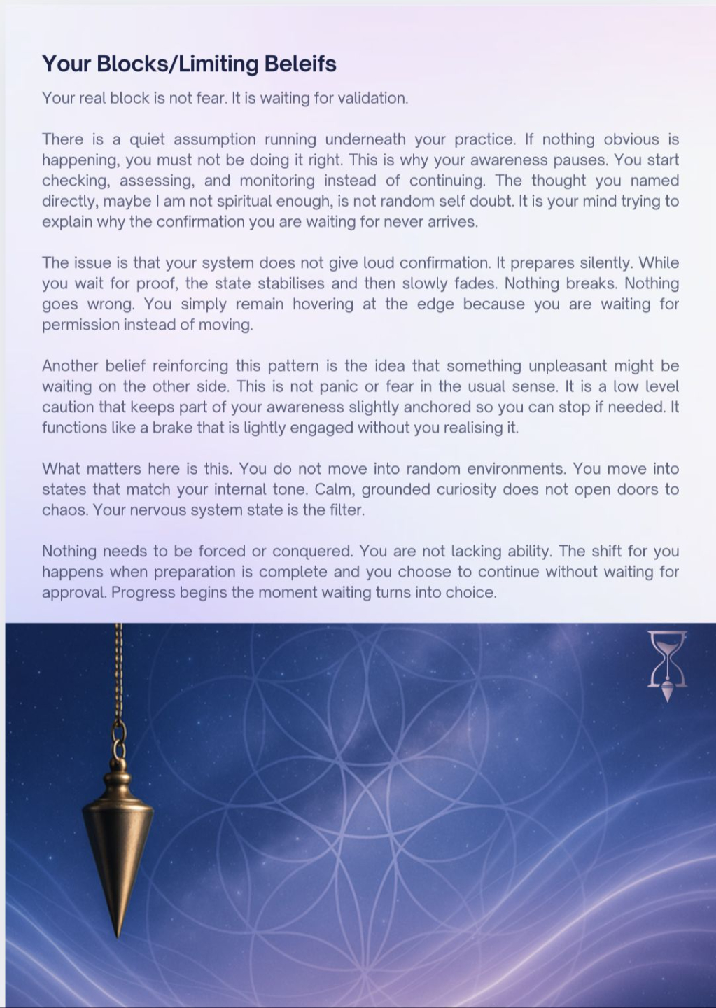 This is the heart of the blueprint. It’s where everything becomes personal. This section reflects you back to yourself and explains how your mind, awareness, and energy naturally operate when you move toward altered states. It’s meant to feel like recognition rather than instruction. When you read this, you should feel seen and understood, not analysed. This is where the “oh… that’s exactly me” moment usually happens.