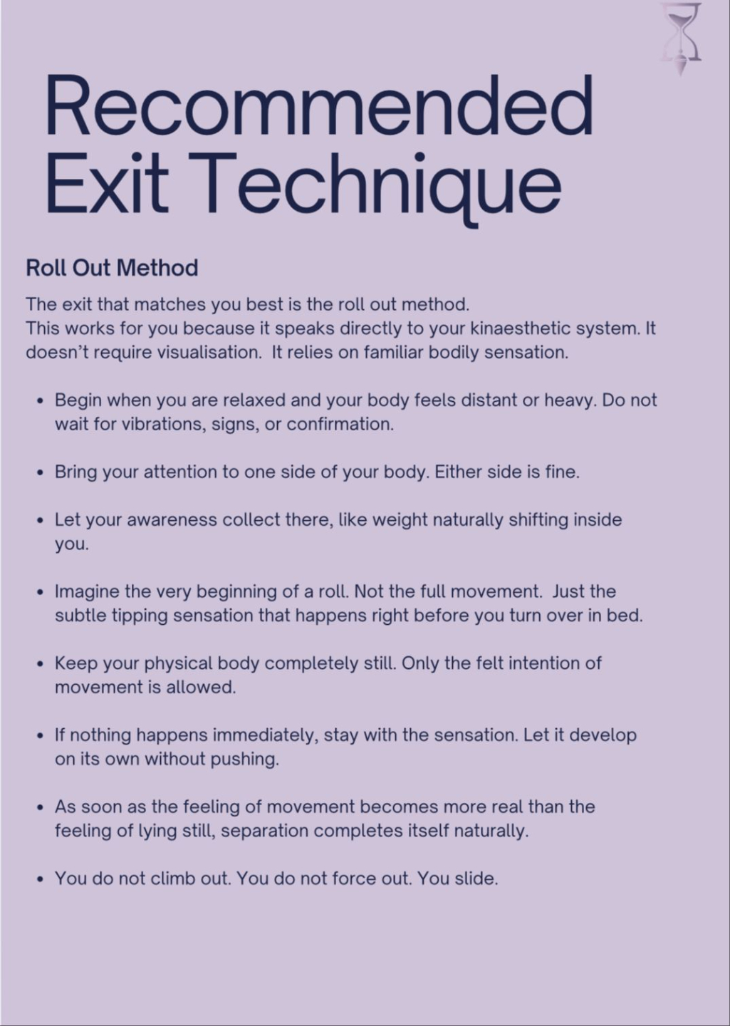 This is the most practical part of the blueprint. Based on your dominant rep system, you’re given one primary exit technique that matches how your awareness already moves. This section explains why that technique works for you and walks you through how to do it in a way that feels realistic, grounded, and doable. It’s written so you could try it tonight without overthinking