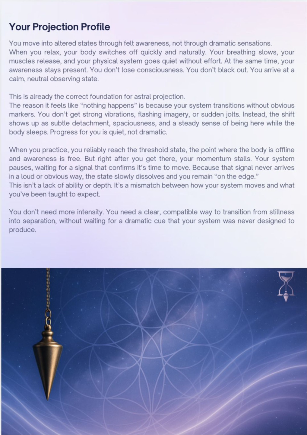 It looks at how your awareness naturally operates, how you approach altered states, and what’s happening for you right before the experience collapses or fades. From that, it identifies your projection profile, your current stage, the main block holding you at the edge, and the type of exit approach most compatible with your mind and nervous system.