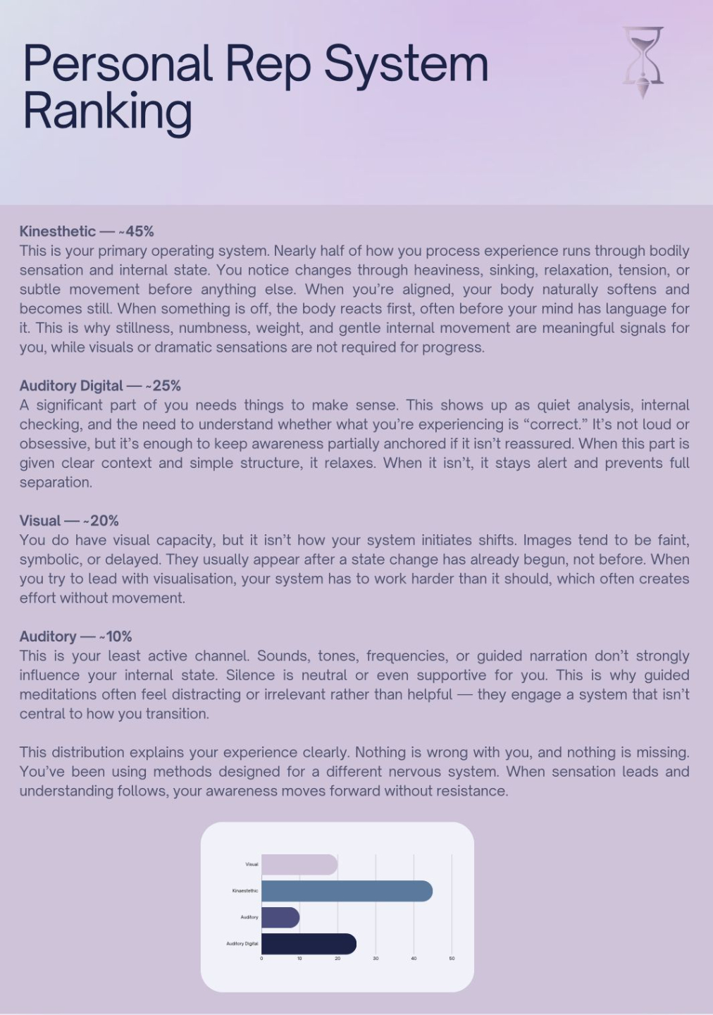This section shows how your awareness prefers to process reality, ranked from strongest to weakest across the four representation systems. It explains how each one shows up in your inner world and how it influences your astral attempts. The goal here isn’t labels. It’s orientation. Once you know how your system already works, you stop trying to force techniques that fight your natural wiring.