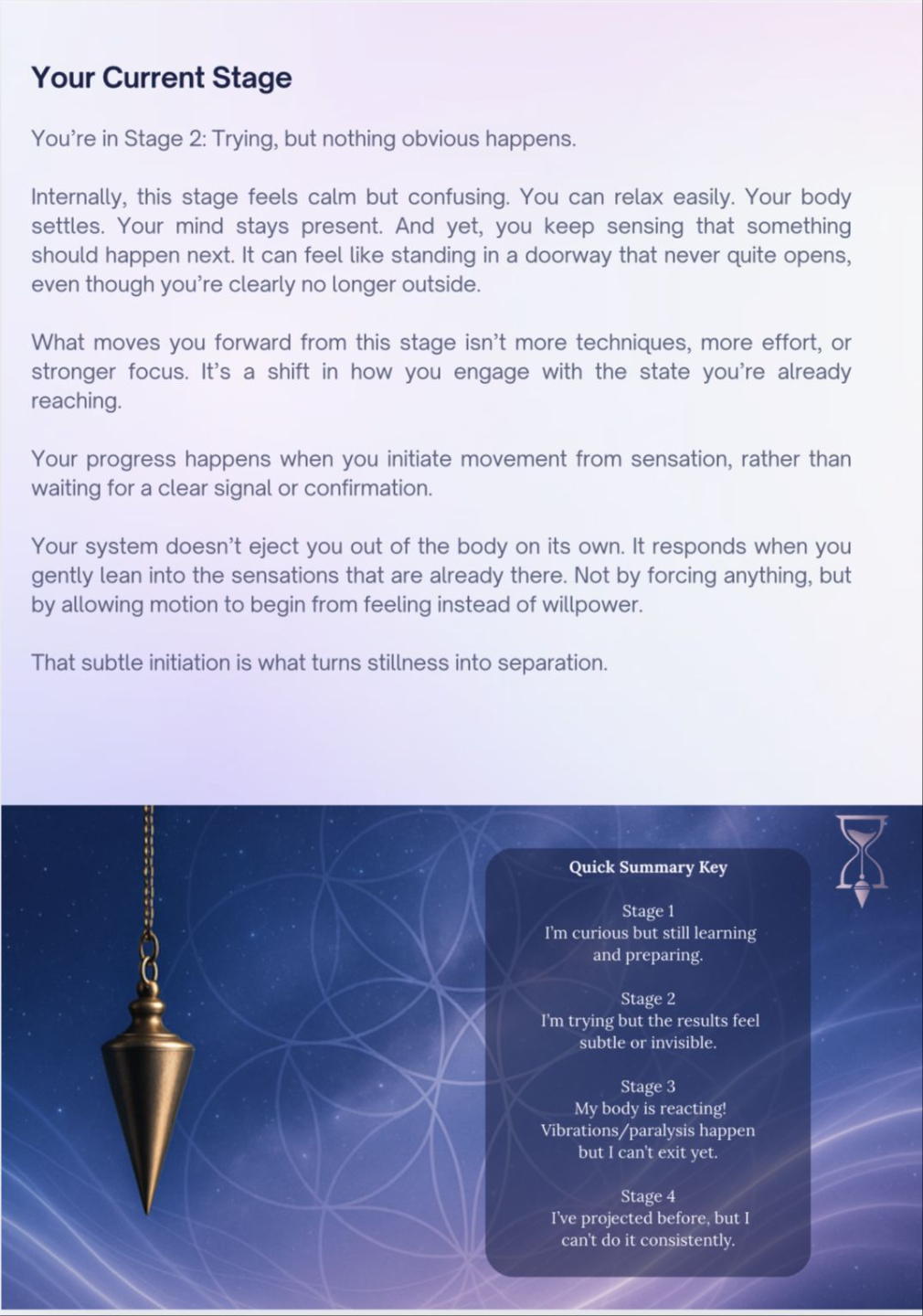 Here you’re placed into one clear stage of the astral journey, not as a judgement, but as a snapshot of where your system is right now. This section describes what that stage feels like internally and, more importantly, what actually moves you forward from here. There’s no pressure to rush. The focus is on stabilising what’s already happening so progression becomes organic instead of forced.
