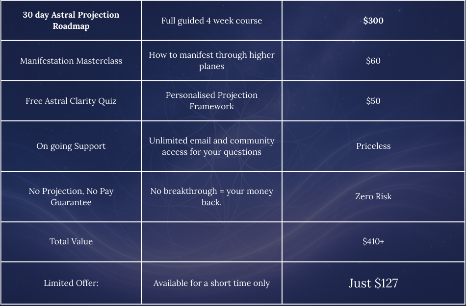 In this 30-day program, you’ll master the 3 Stages of Projection, dissolve subconscious fear with NLP tools, and finally experience conscious separation If you finish the 30-day course and don’t project within 60 days, you’ll get your money back — no questions asked