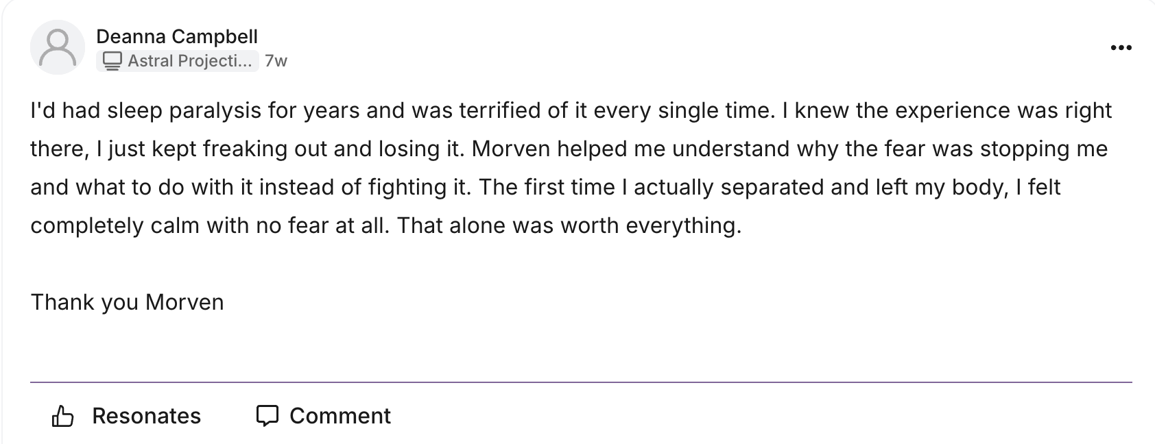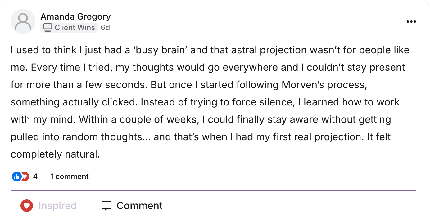 A 12 week group programme that conditions your mind to believe astral projection is not just possible, but inevitable. The result? Consistent out-of-body experiences, removed mental blocks, and the ability to consciously shape your reality.